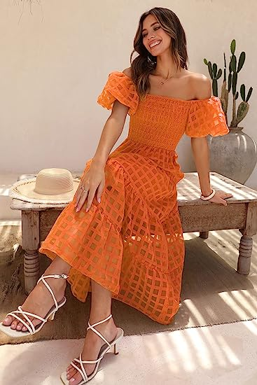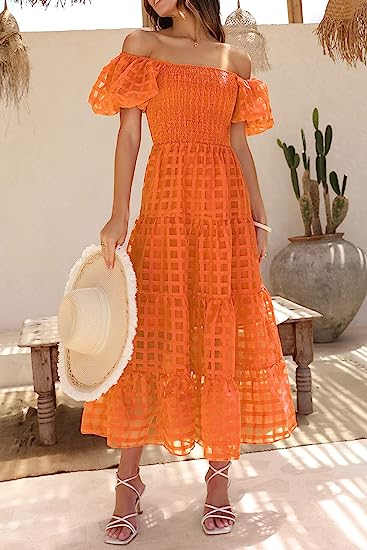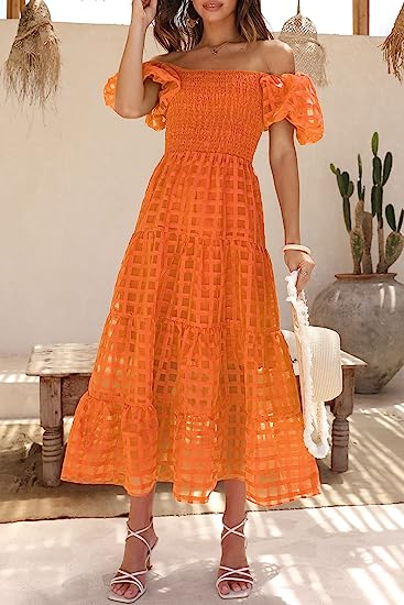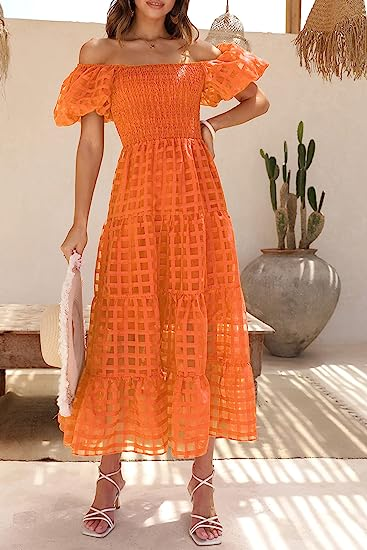 PRETTYGARDEN Women's Casual Summer Midi Dress Puffy Short Sleeve Square Neck Smocked Tiered Ruffle Dresses